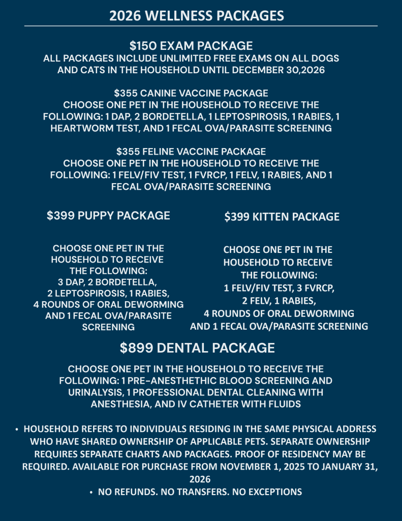 2025/2026 PACKAGES ARE AVAILABLE FOR PURCHASE 11/1/25-1/31/26. MARK YOUR CALENDARS!! JUST A FRIENDLY REMINDER THAT ALL PACKAGES COME WITH UNLIMITED EXAMS FOR ALL PETS IN THE HOUSEHOLD. NO TRANSFERS, NO REFUNDS, NO EXCEPTIONS!!